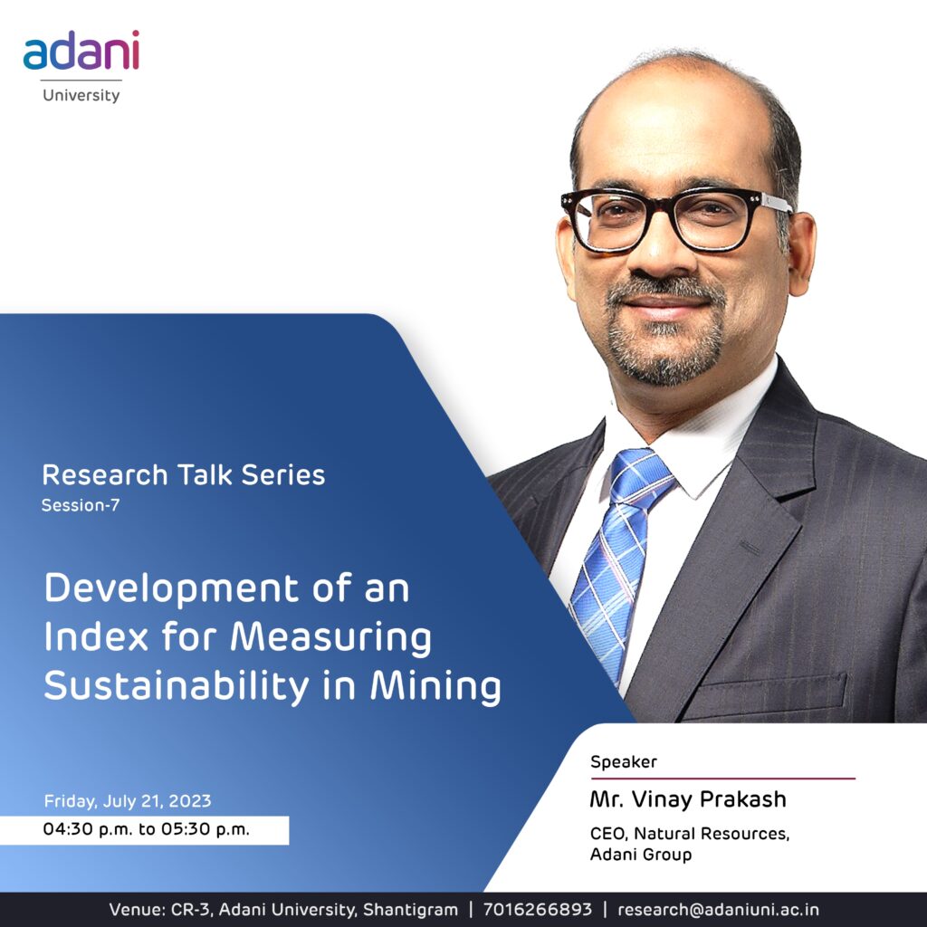 Development of an Index for Measuring Sustainability in Mining Previous Next The seventh edition of the Research Talk Series featured Dr. Vinay Prakash, CEO of Natural Resources at Adani Group. Students of MBA (Infrastructure Management) also participated in the Talk, where Mr. Prakash shared his thoughts on the practical challenges and prospects of developing an […]
