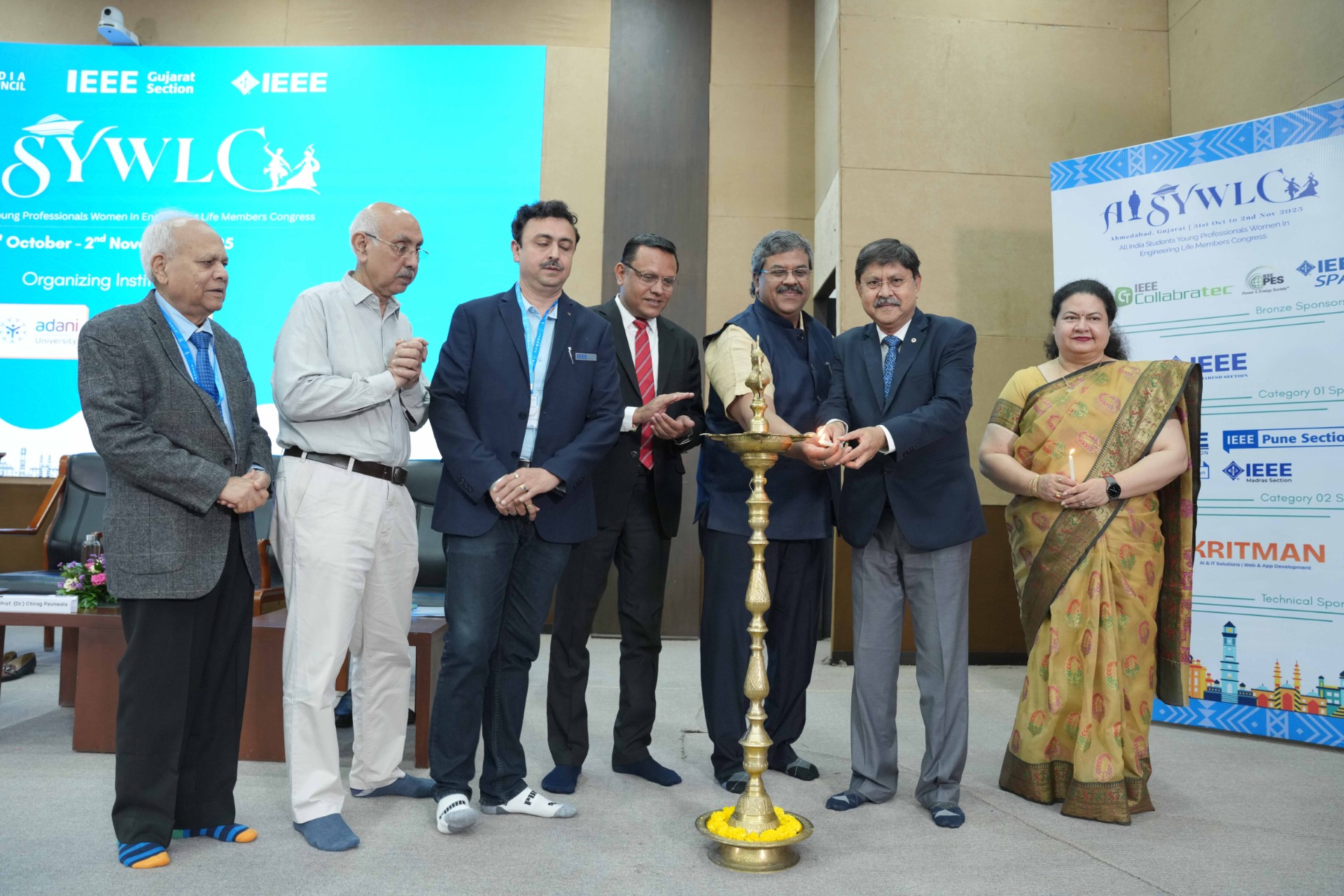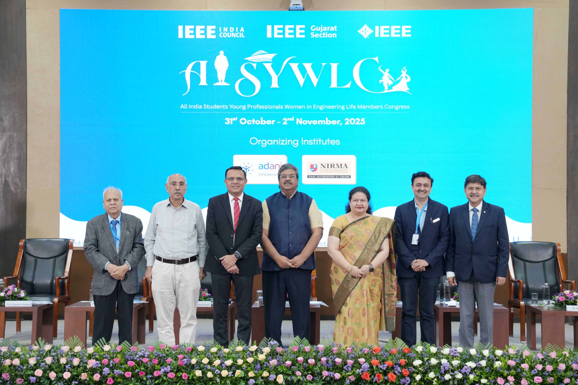Adani University, in collaboration with Nirma University and the IEEE India Council, has hosted the prestigious All India Student, Young Professionals, Women in Engineering, and Life Members Congress (AISYWLC 2025). The Inaugural ceremony featured a distinguished address by Prof. Dhaval Pujara, Provost, Adani University. The event witnessed the presence of eminent personalities including Dr. Narottam Sahoo, Advisor-GUJCOST, Prof. Dharmendra Singh, Director, IIIT Vadodara; Mr. Deepak Mathur, Vice President, IEEE Member and Geographic Activities (MGA); Prof. Prerna Gaur, Chair, IEEE India Council; Prof. Anup K. Singh, Director General, Nirma University; Prof. R. K. Asthana, Chair, IEEE Life Member Committee; and Prof. Chirag Paunwala, Chair, IEEE Gujarat Section.